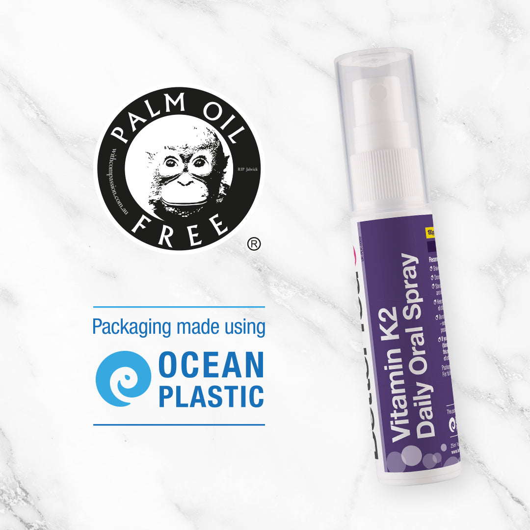 A vitamina K2 presente neste spray é fornecida na forma MK‑7 (K2VITAL®), uma forma microencapsulada de elevada pureza e solubilidade, derivada de flores. Fabricado no Reino Unido em instalações certificadas GMP. Embalagem com cartão FSC® e frasco produzido a partir de plástico recolhido nos oceanos.