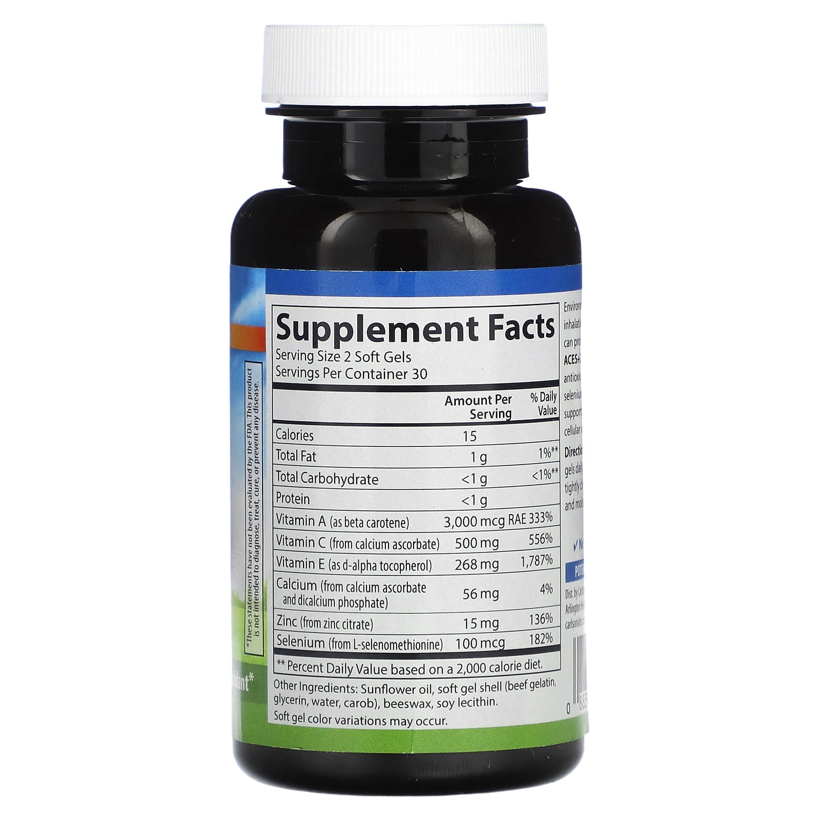 - Conteúdo por dose (2 cápsulas): Vitamina A, Vitamina C, Vitamina E, Zinco, Selénio