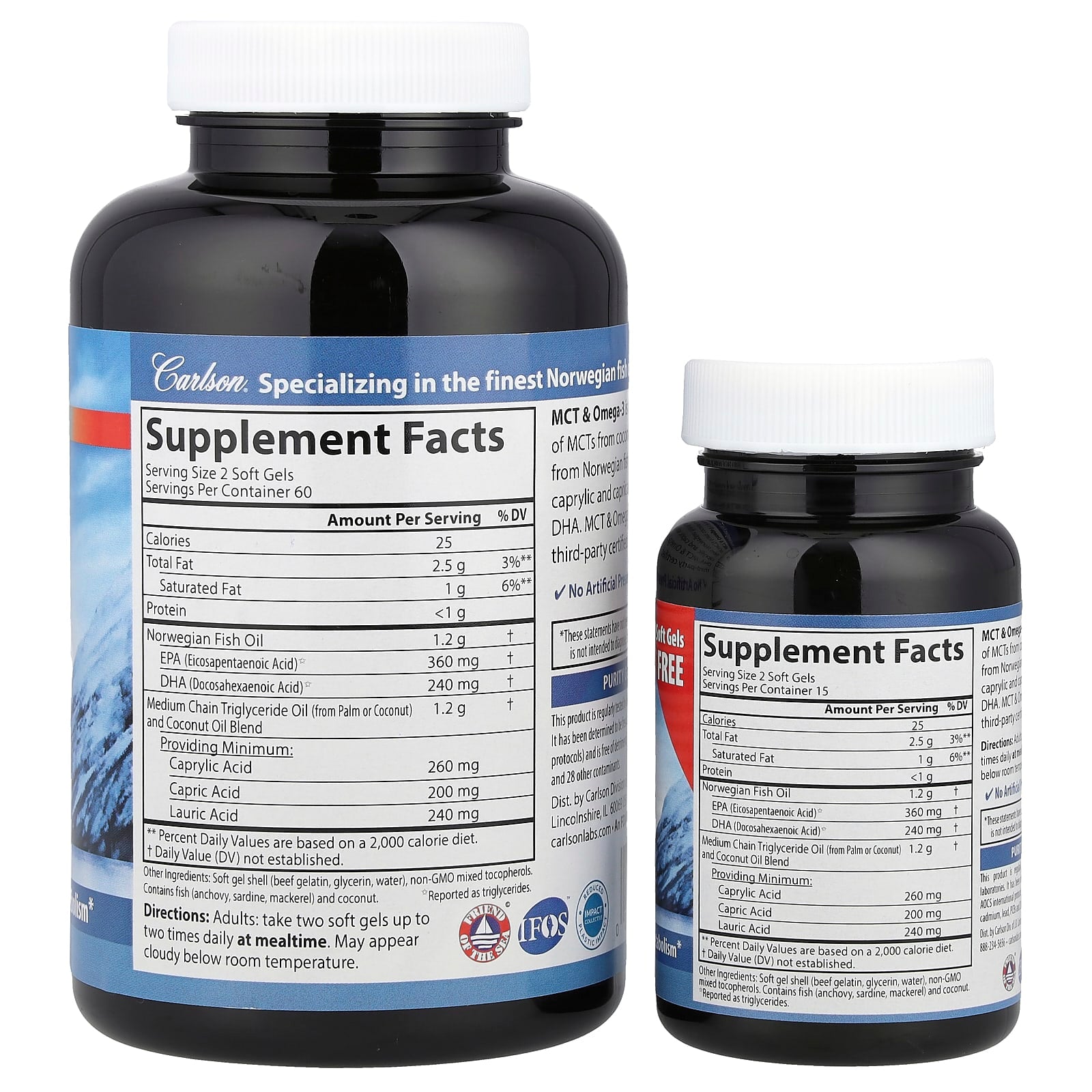 - Tamanho da dose: MCT — 2 cápsulas moles; Ómega‑3 — 2 cápsulas moles