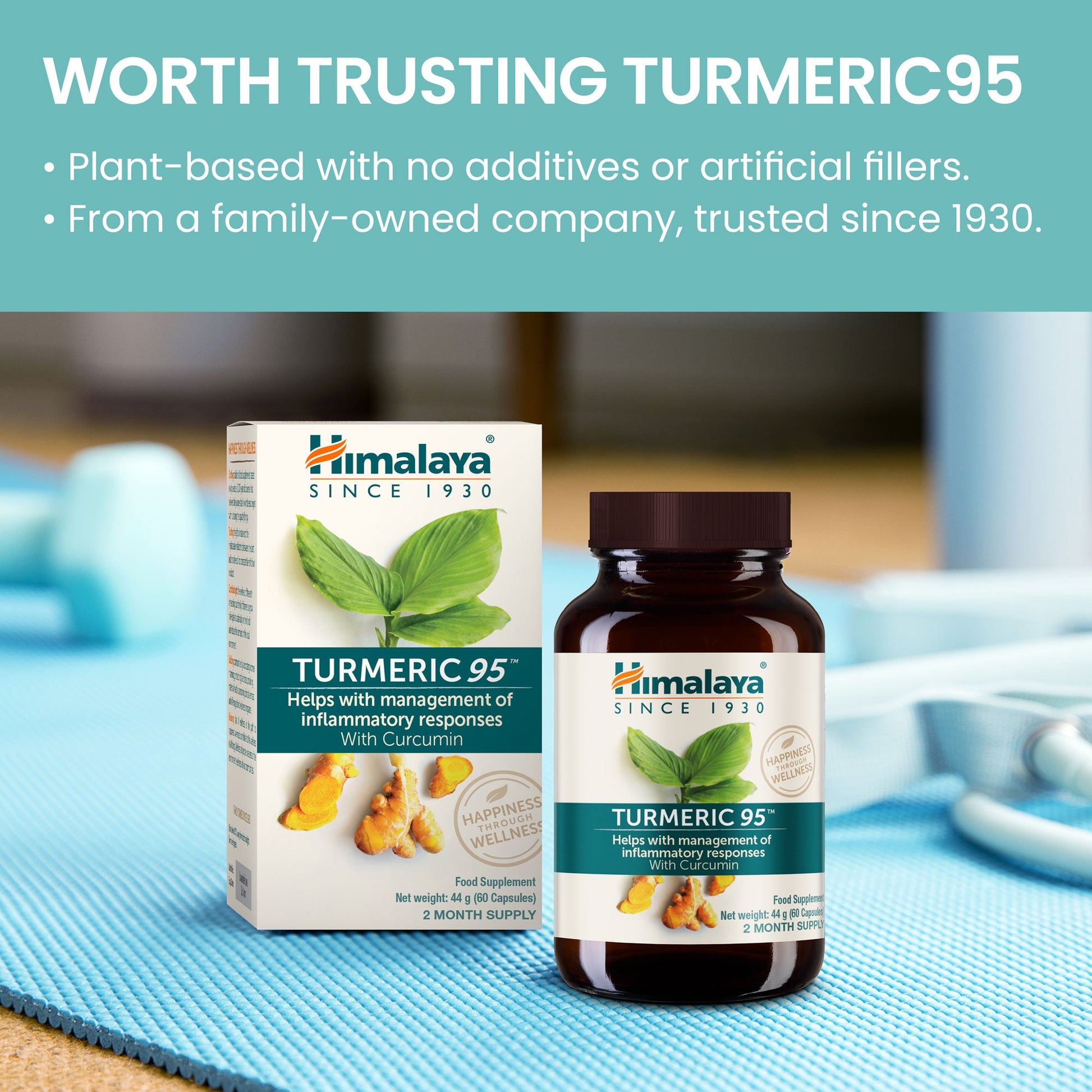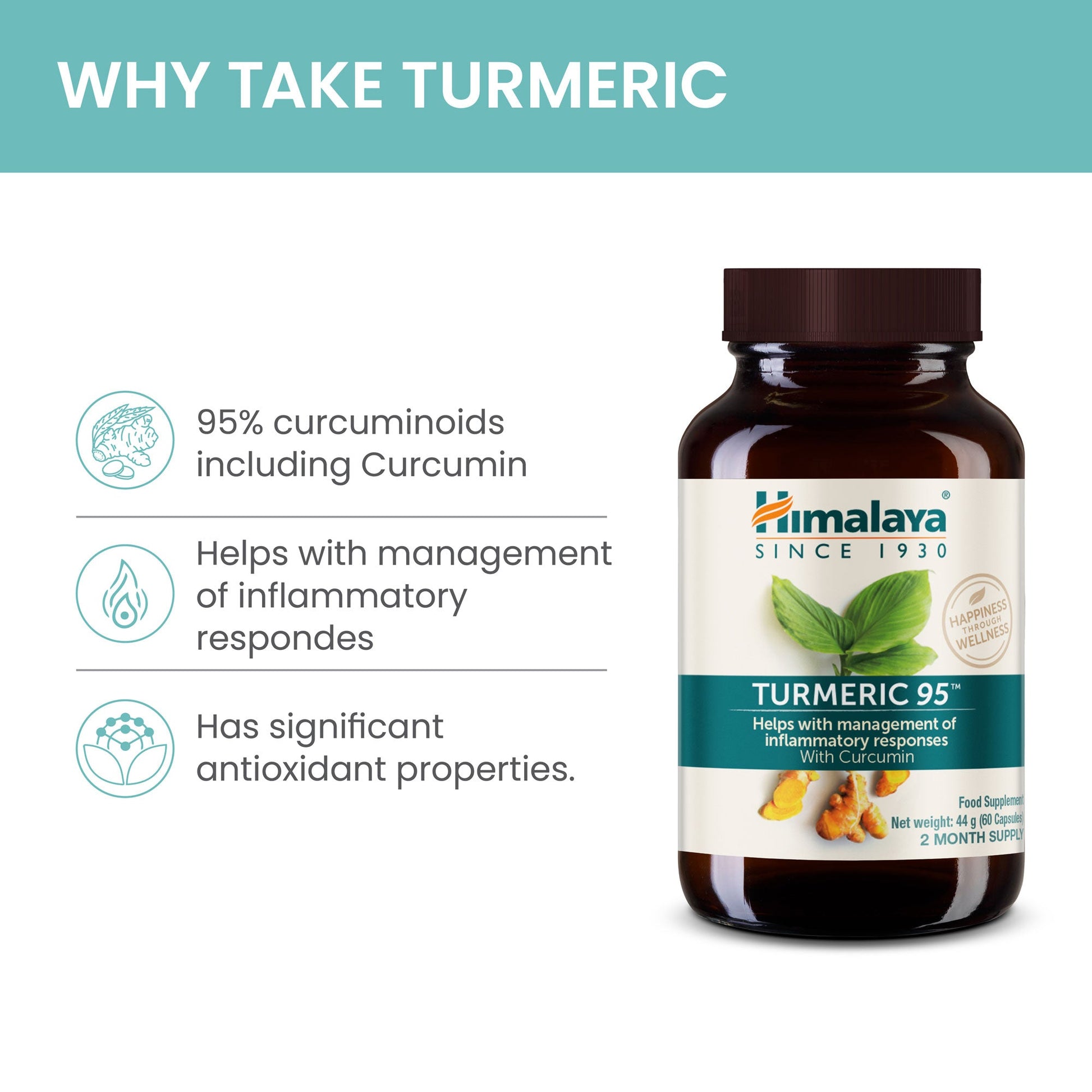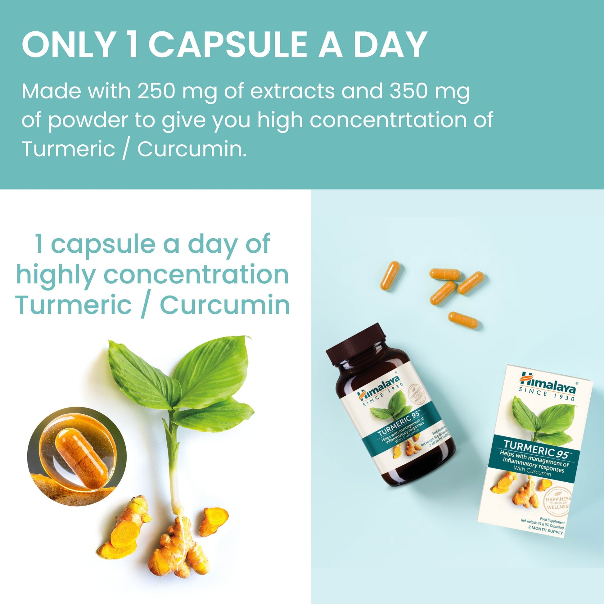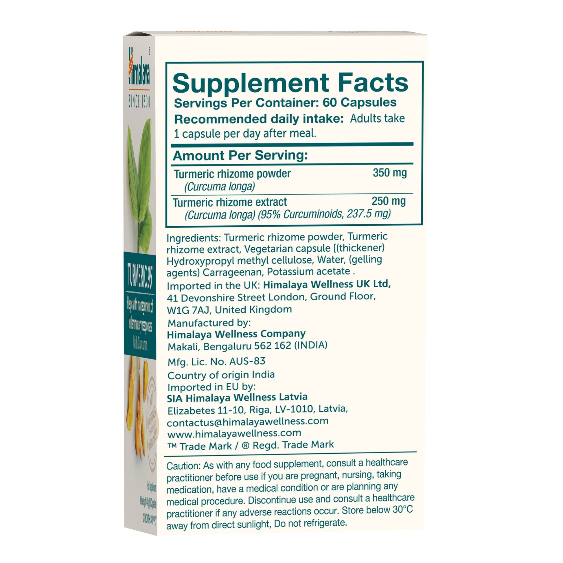 Formulado a partir do rizoma de Curcuma longa (cúrcuma), com um extrato padronizado para assegurar um conteúdo consistente de curcuminoides (95%). A curcumina resulta de processos de extração e padronização controlados. Produto fabricado pela Himalaya em instalações certificadas.