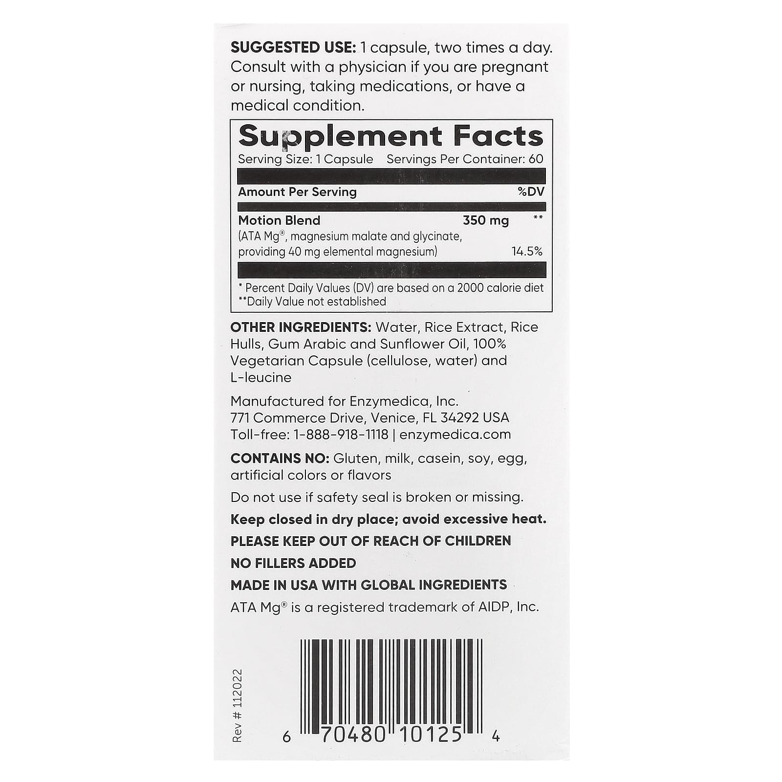 - Concentração por cápsula: Mistura de magnésio (ATA Mg®, malato de magnésio, glicinato) — 350 mg