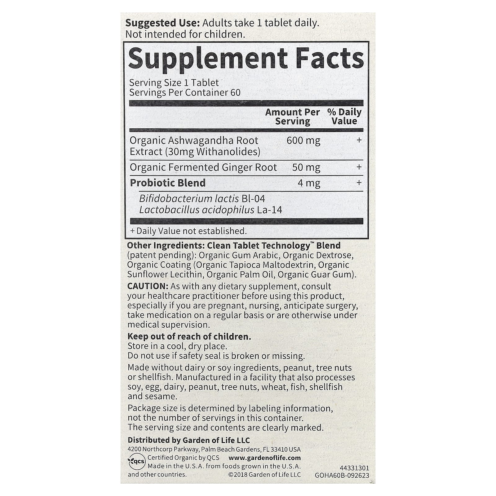 - Extrato de raiz de Ashwagandha orgânica (padronizado para 30 mg de withanolídeos) — 600 mg