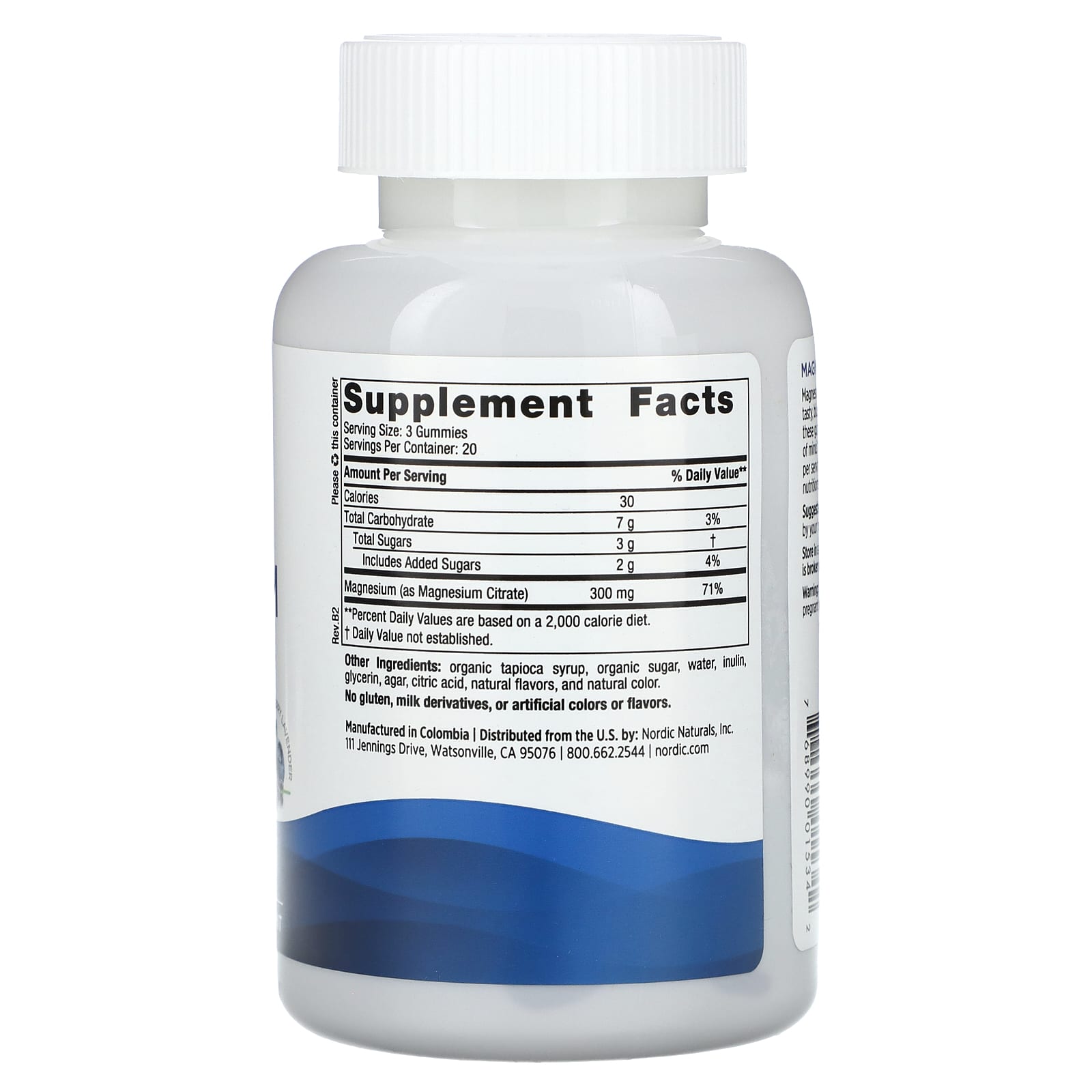 Citrato de magnésio (equivalente a 300 mg de magnésio por dose de 3 gomas), xarope de tapioca orgânico, açúcar orgânico, água, inulina, glicerina, ágar, ácido cítrico, aromas naturais (mirtilo e lavanda), corante natural. Pode conter traços de frutos de casca rija devido ao processamento.