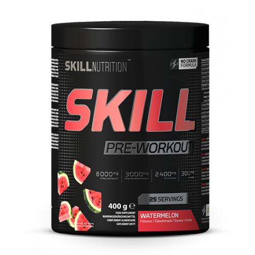 Formulado pela Skill Nutrition, este pré-treino combina aminoácidos, creatina e extratos padronizados com sistemas de cafeína de libertação imediata e prolongada. Os ingredientes provêm de fontes industriais e são processados para criar uma mistura em pó solúvel adequada para consumo imediato antes do treino.